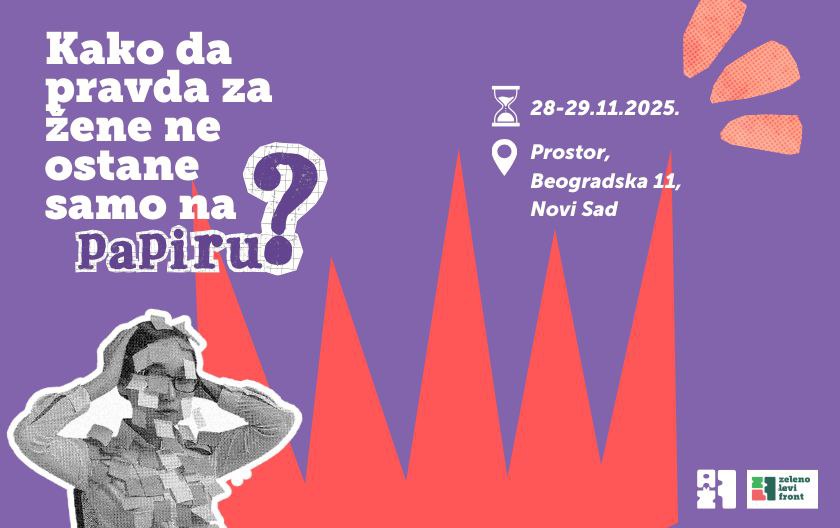 Autonomni ženski front i Zeleno-levi front pozivaju vas na dvodnevnu konferenciju „Kako da pravda za žene ne ostane samo na papiru?“, koja će biti održana 28. i 29. novembra u Novom Sadu i Petrovaradinu.